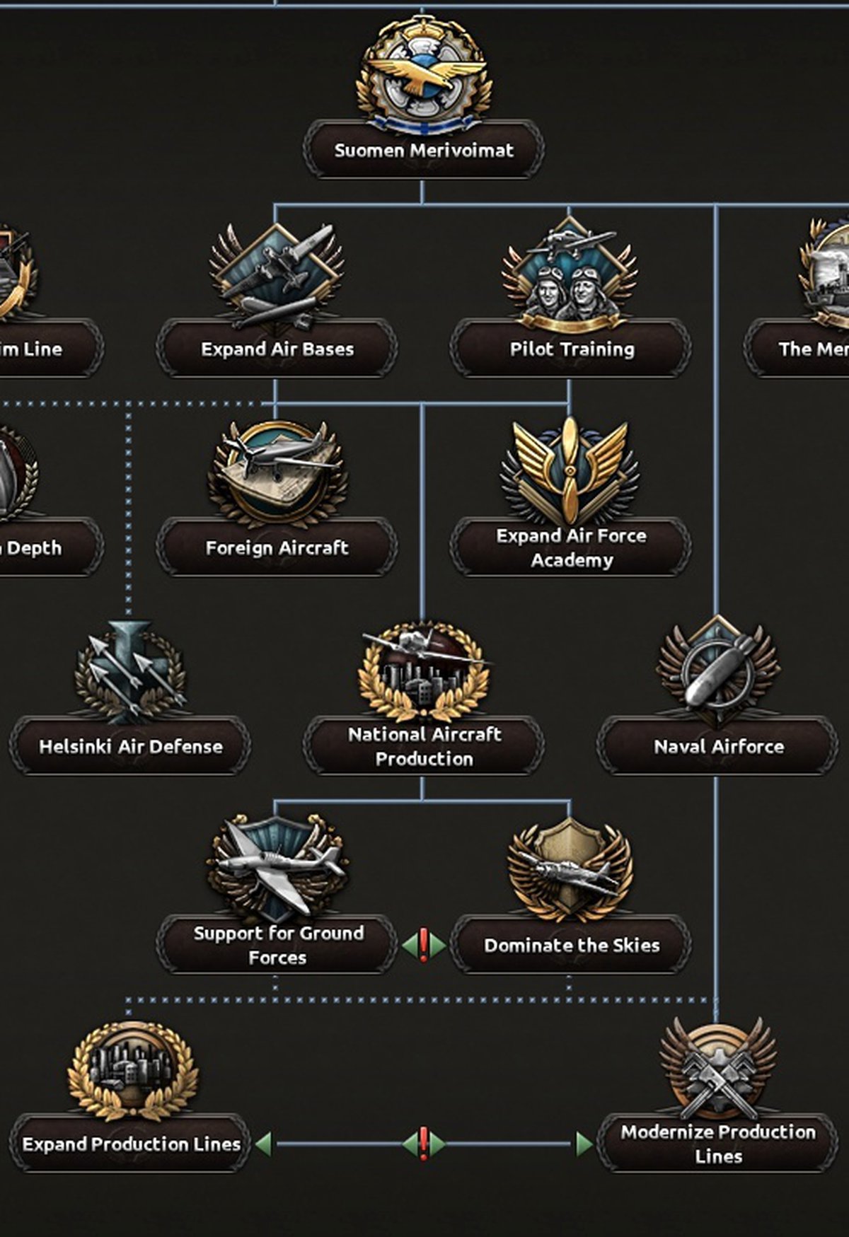 А теперь обратимся к ветке авиации. Подобно армейской ветке «Suomen Merivoimat» даст национальных дух «финские ВВС», который можно будет улучшить, продвигаясь по ветке.