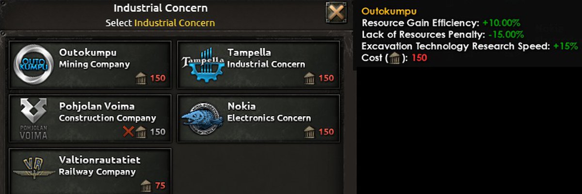 «Аландский банк» временно улучшит показатель товаров народного потребления, а «Suomen Akatemia» даст дополнительную ячейку исследований. Несколько фокусов, связанных с добычей ресурсов, как правило, увеличат производство ресурсов в регионе, заодно давая ячейки сооружений, гражданские фабрики, ж/д и тому подобное.