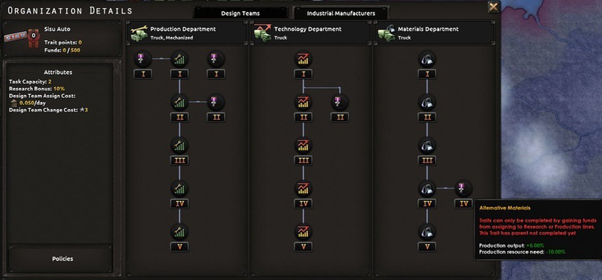 Слева находится несколько промышленных фокусов, соединённых с веткой промышленности, что помогут привести финскую промышленность и линии снабжения в хорошее состояние.