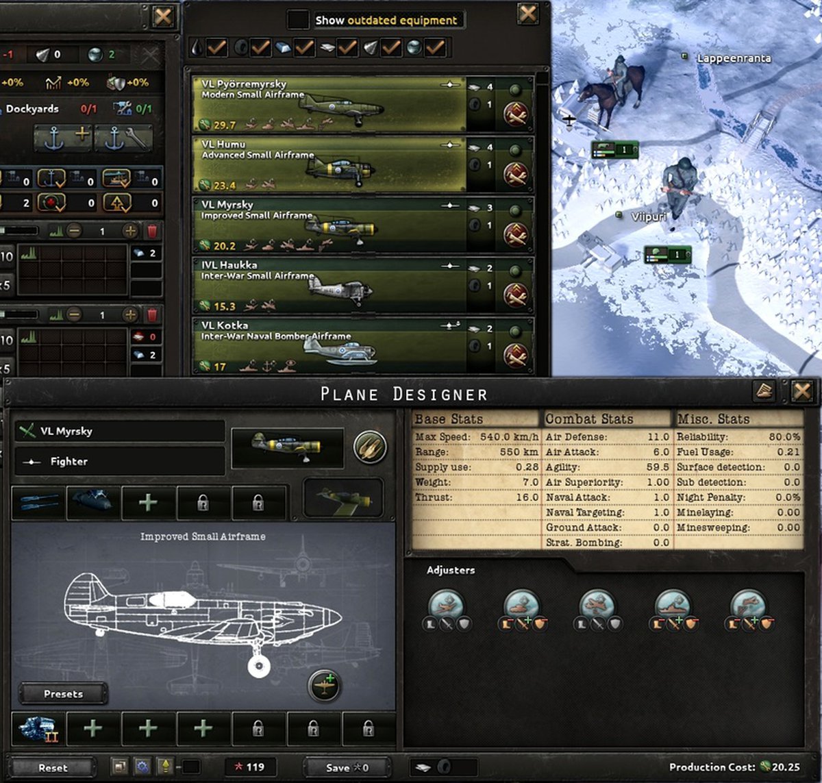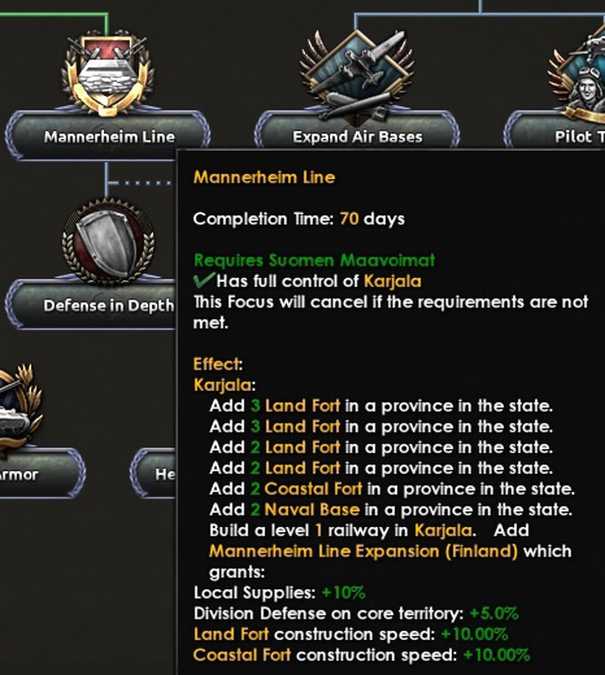 Правее фокусы «Линия Маннергейма», «Глубокая оборона» и «Противовоздушная защита Хельсинки» усилят возможности для обороны, укрепят некоторые регионы, особенно Карелию, и предоставят лучшее снабжение и Ж\Д пути на юго-восточной границе.