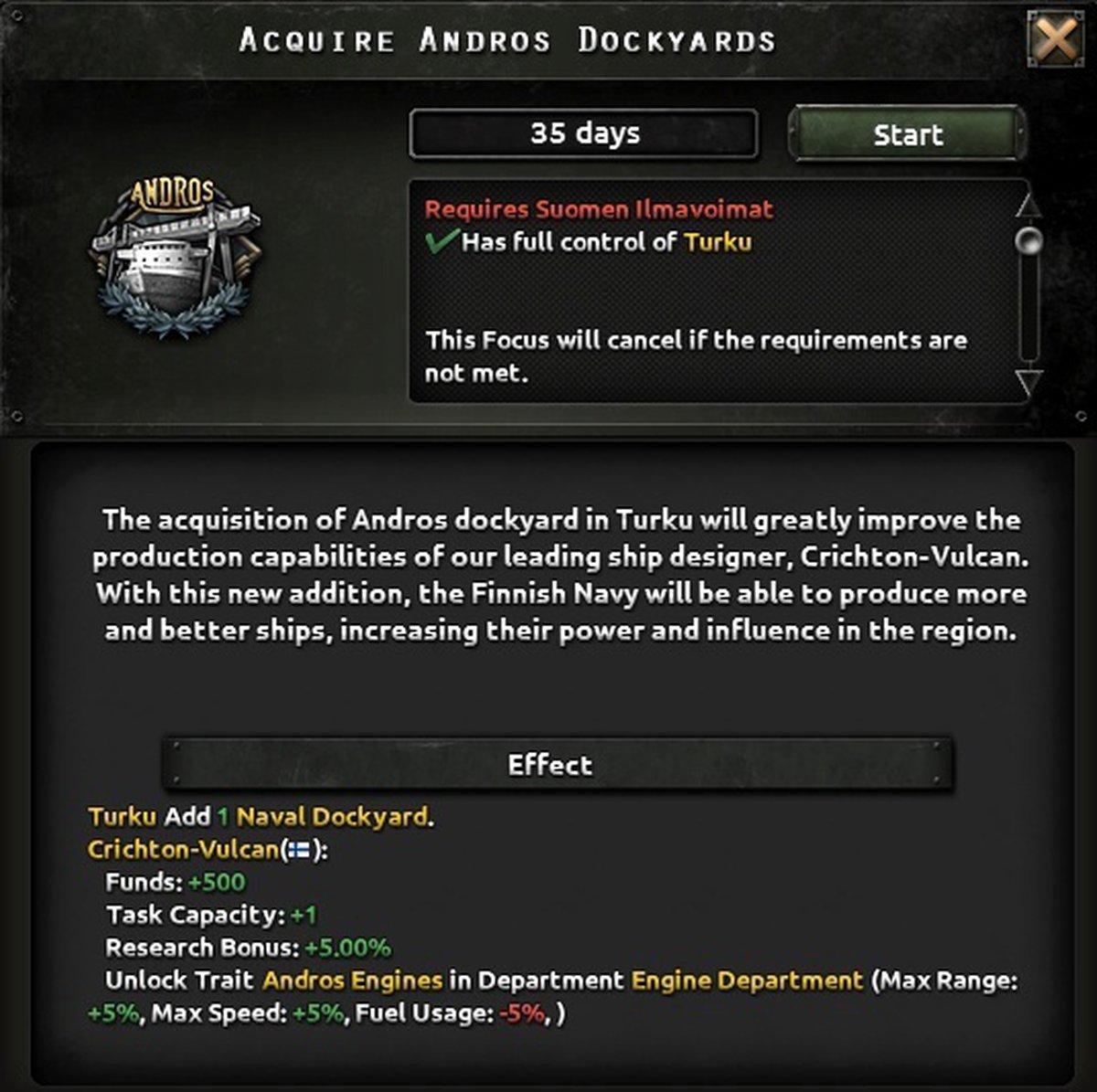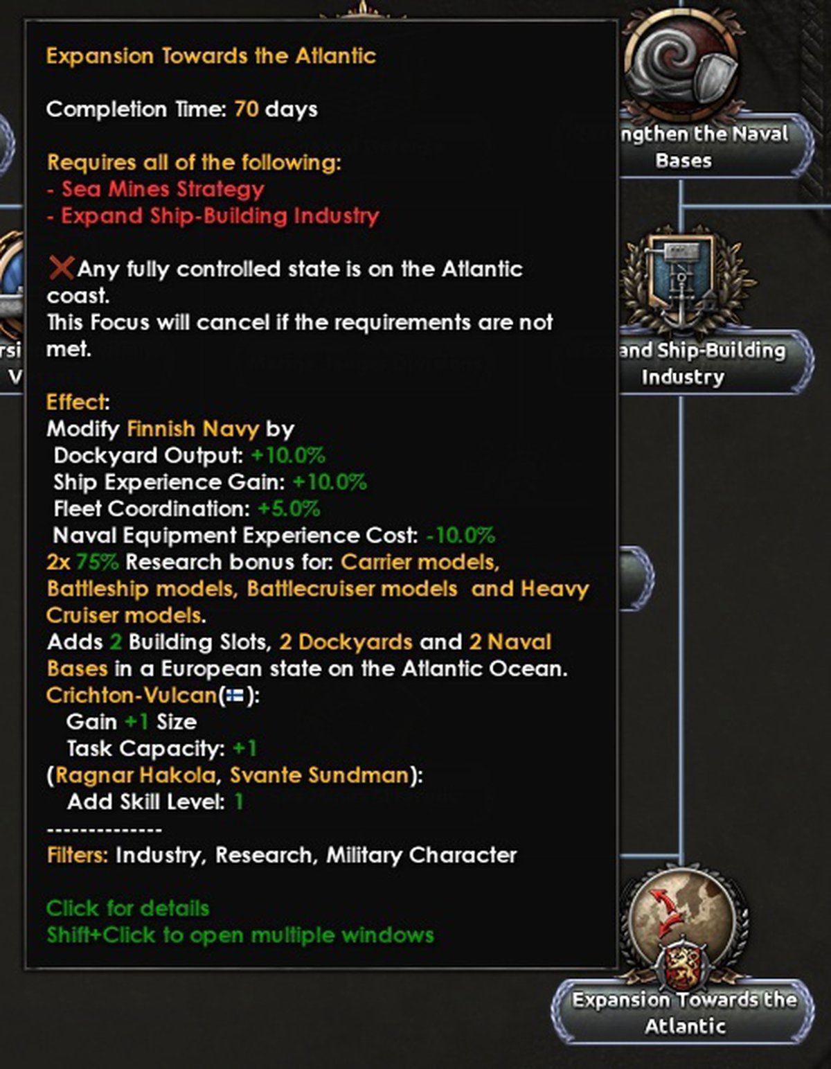 Последний фокус в ветке — «Экспансия в Атлантику» даёт действительно сильный бонус позволяющий Финляндии контролировать хотя бы один прибрежный регион в Атлантике.