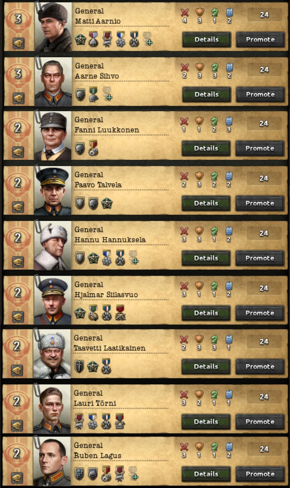 Затем генералы. У них ожидается много черт, позволяющих эффективнее использовать погодные условия и рельеф при обороны. Всё-таки важная черта финской армии - адаптивность.