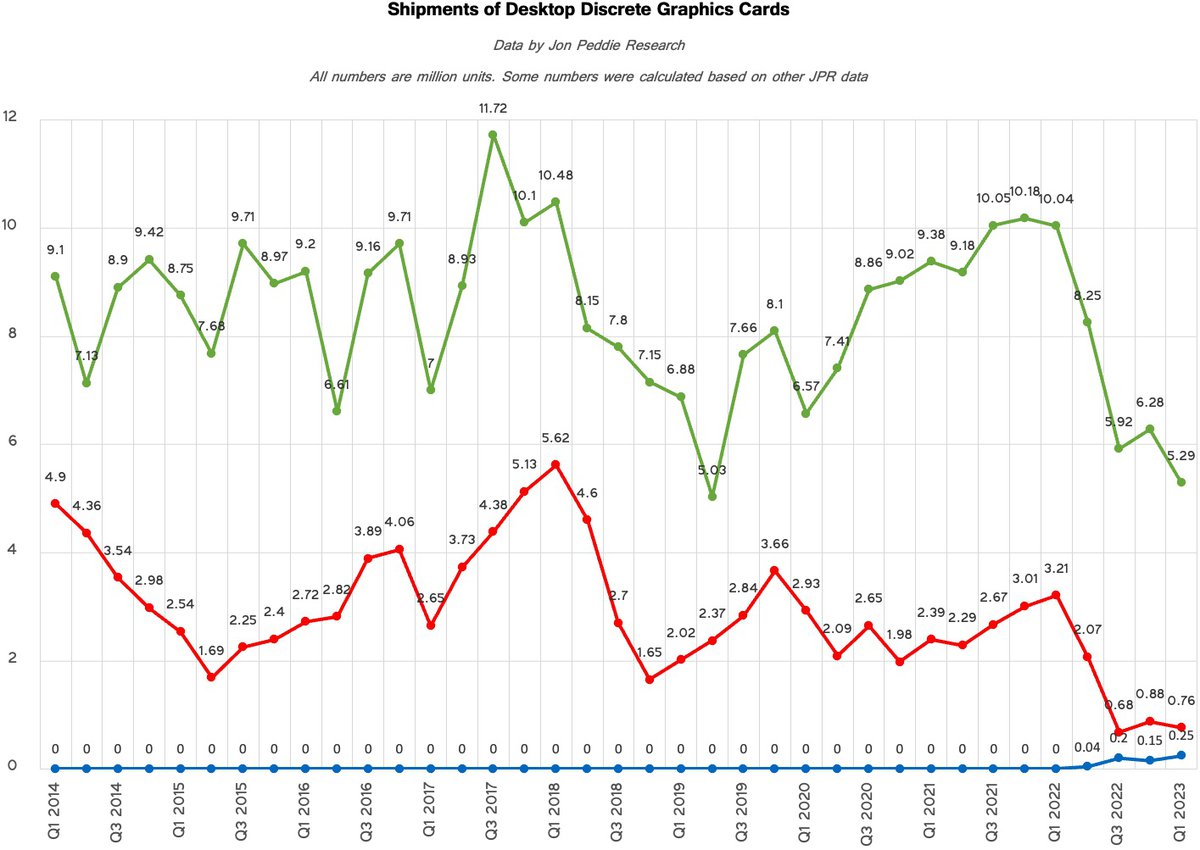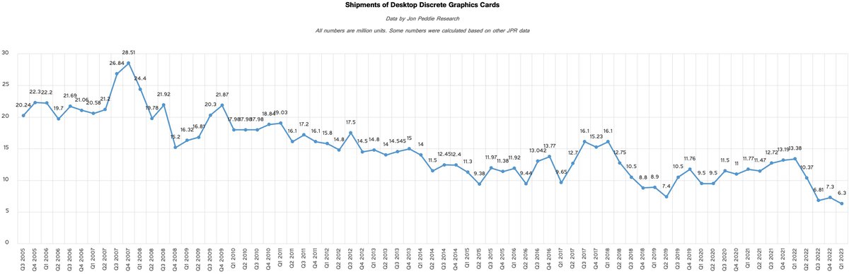 В первом квартале 2023 года производители дискретных видеокарт отгрузили 6.3 миллиона устройств, подсчитали в аналитической компании Jon Peddie Research. Согласно данным аналитиков, это худший результат с 2005 года.