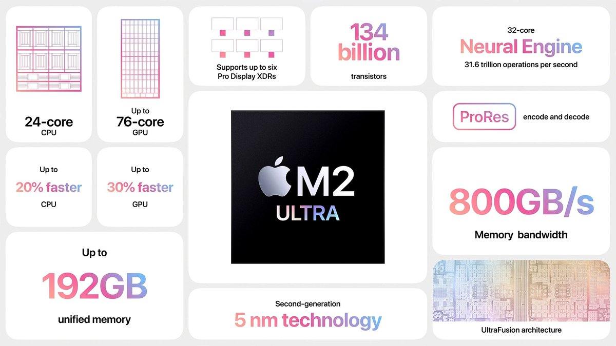 Чип M2 Ultra может нести до 76 графических ядер и 24 процессорных ядра. По оценке Apple, чип до 30% быстрее устройства предыдущего поколения.