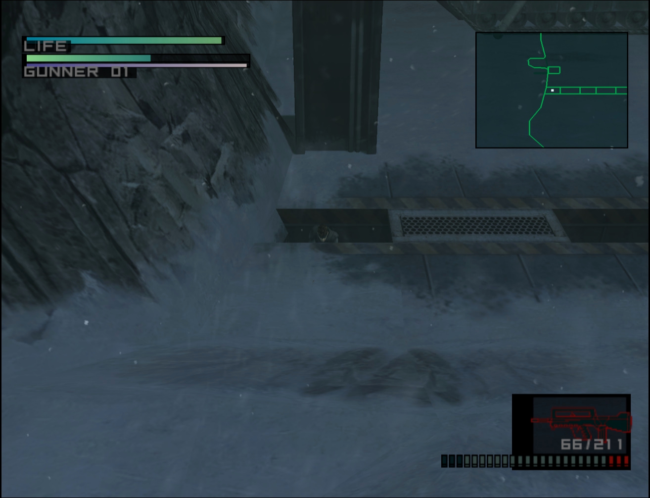 Перед локацией с Метал Гиром, на мостиках расположены пулемёты, в оригинальной игре их больше десяти, когда как в ремейке их число сократили до четырёх.