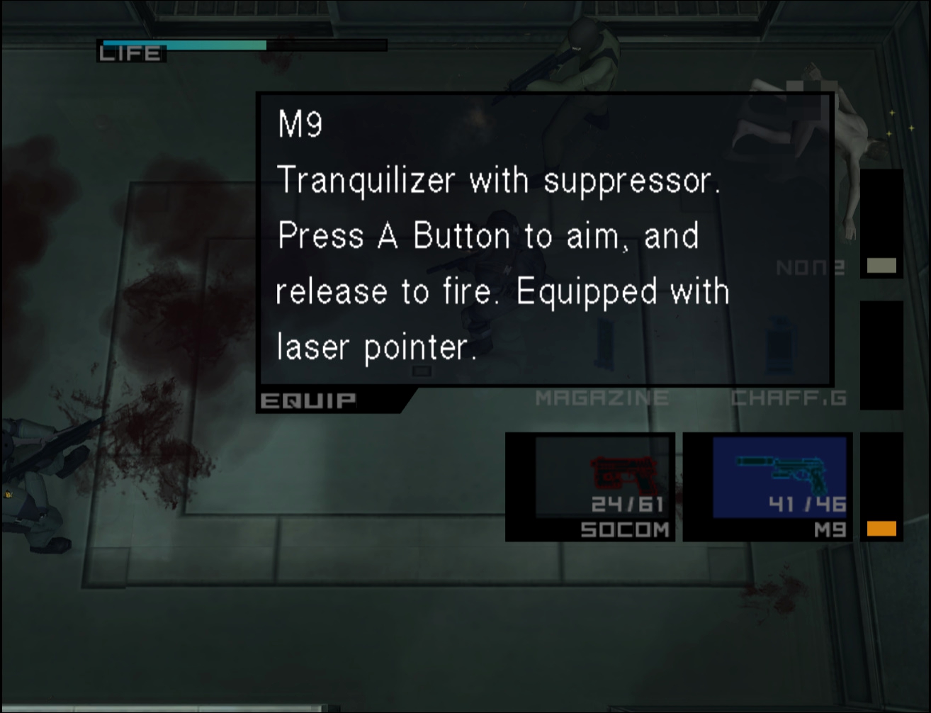 1. Транквилизатор (пистолет, М9) – на самом лёгком уровне сложности находится у игрока с самого начала игры. На сложности лёгкий и выше – находим по ходу прохождения. Выстреливает дротиками и усыпляет как врагов, так и Мэрил. На очень лёгком уровне сложности враги от дротика валятся мгновенно, а вот на средней сложности нужно подождать, пока снотворное подействует.