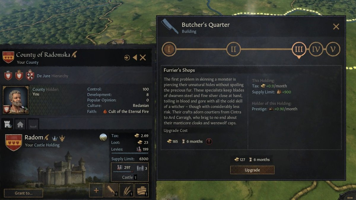 Но остаётся главный вопрос - когда появятся ведьмаки? Ответ - в обновлении 3.0. Там даже появится возможность содержать придворного ведьмака, которого можно на события с чудищами отправлять. Ведьмаки будут отличаться в зависимости от школ, удержать их при дворе будет трудно, а если путешествующим ведьмакам регулярно не платить за заказы, то скоро они перестанут ходить по владениям персонажа.