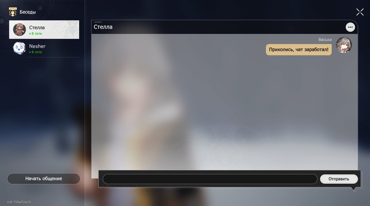 Чат позволяет общаться только с друзьями и поддерживает только текстовые сообщения. К сожалению, в чате нельзя пользоваться стикерами, регулярно мелькающими в сюжетных переписках с персонажами Honkai Star Rail.