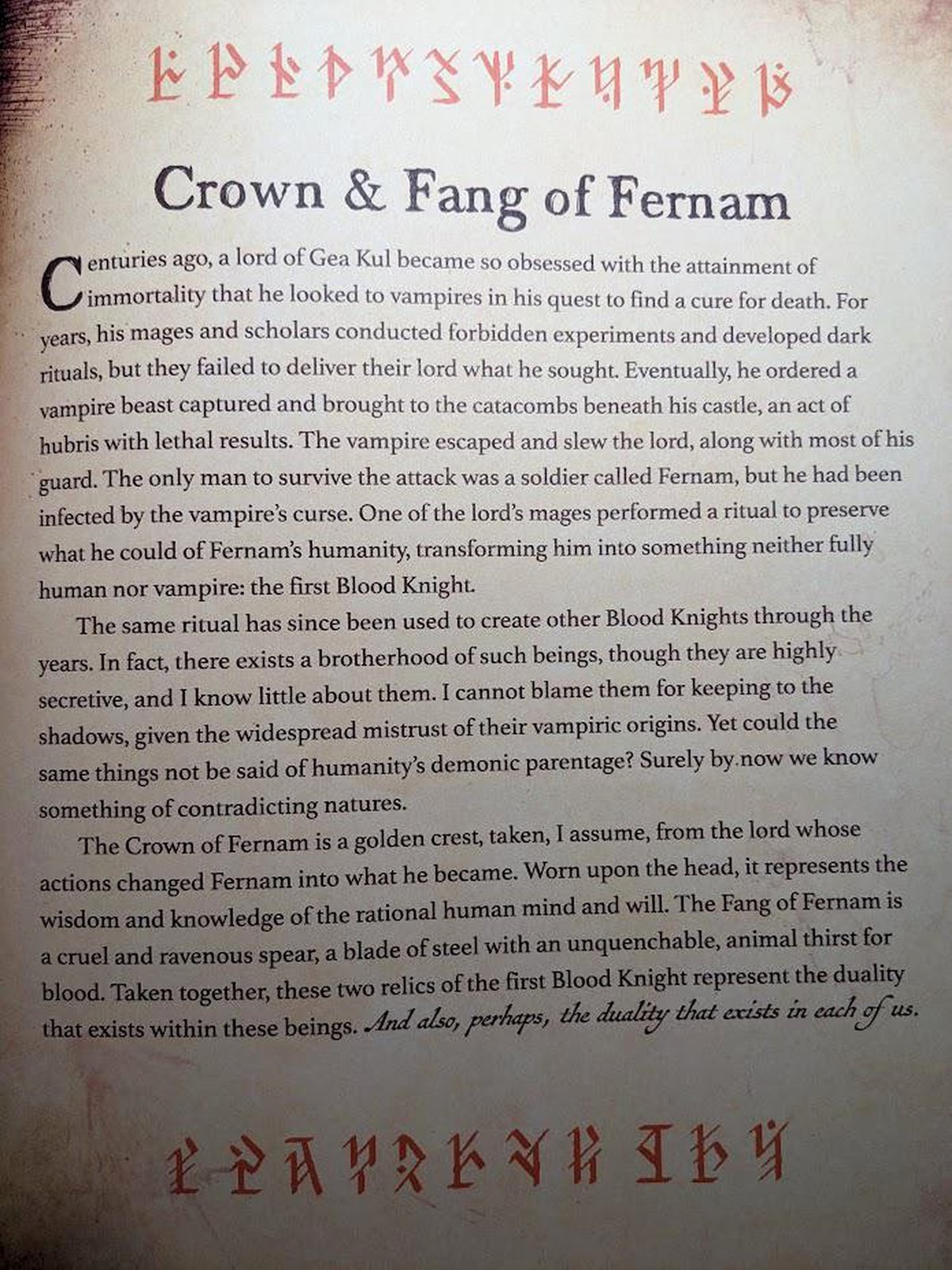 Воин стал первым из Рыцарей Крови — не вполне вампиром, но и не человеком. Позже похожим образом были созданы и другие Рыцари, создавшие собственное братство.