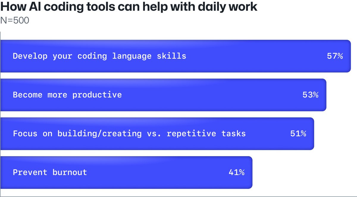 Еще один интересный момент: благодаря ускорению разработки с помощью ИИ программисты надеются тратить больше времени на продумывание создаваемых продуктов и решений. Значительная часть разработчиков верит, что ИИ поможет им меньше выгорать.