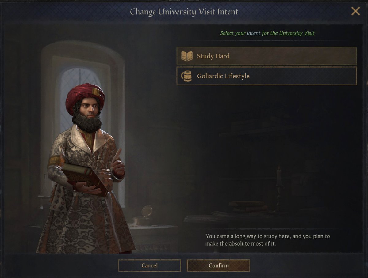 В процессе обучения может быть только два намерения: учиться или пить, гулять, развлекаться. В первом случае увеличивается шанс успешно завершить курс и получить награды за него. Во втором случае можно тоже получить опыт, только не ветки учёности. Там также есть разные черты и награды, последние чаще всего будут бонусами, которые можно получить прямо сейчас, а не в долгосрочной перспективе.