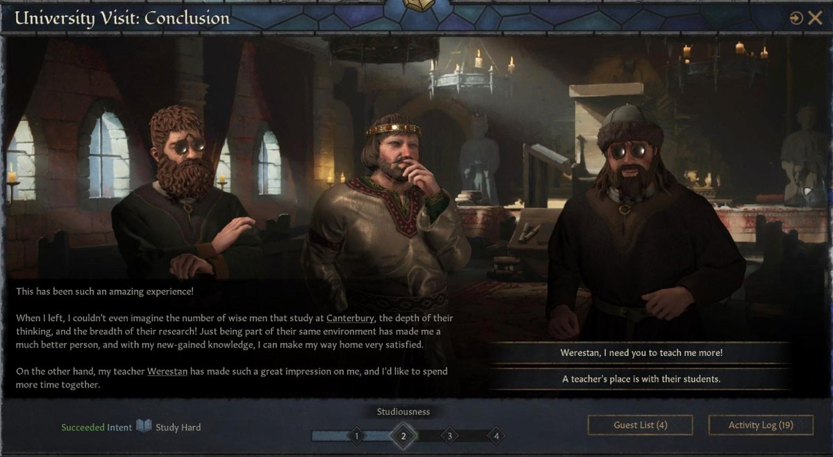 Как было сказано, учителя - умнейшие люди на карте. Одного по итогу можно пригласить ко двору, если в ходе обучения удастся его впечатлить.