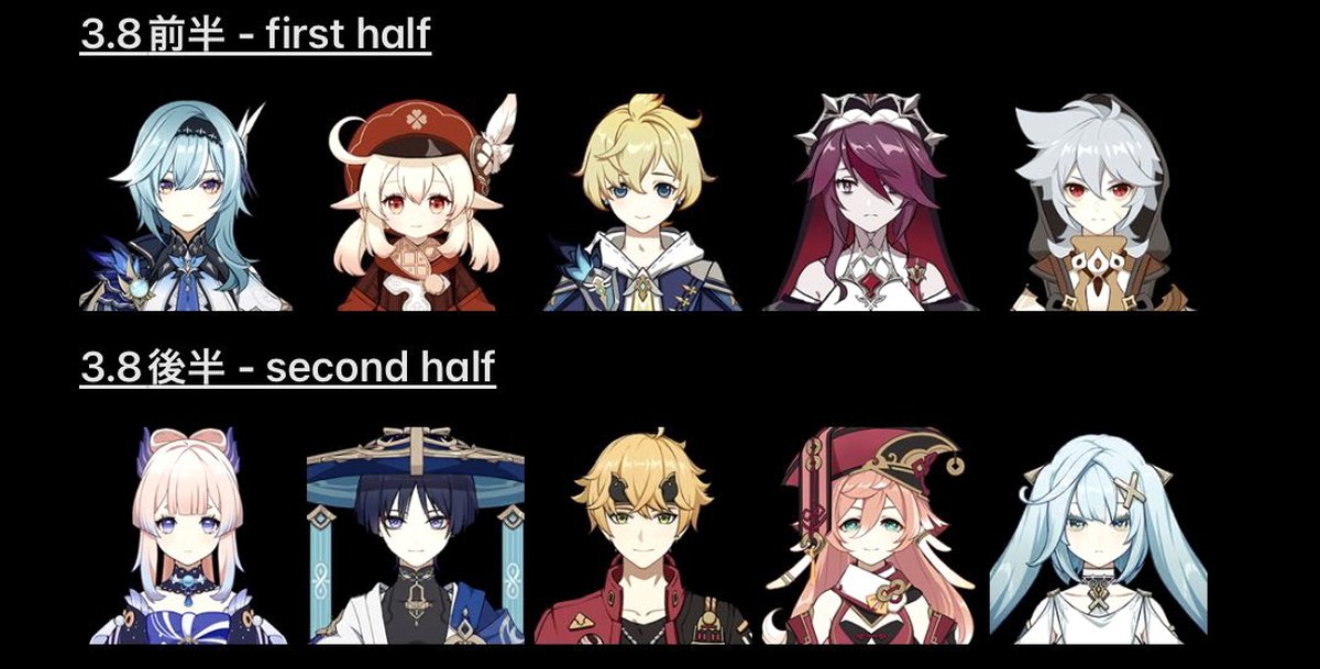 Предполагается, что в обновлении 3.8 не будет новых героев: игроков ждут только рераны существующих персонажей. Также опубликован состав первого баннера оружия обновления 3.8.