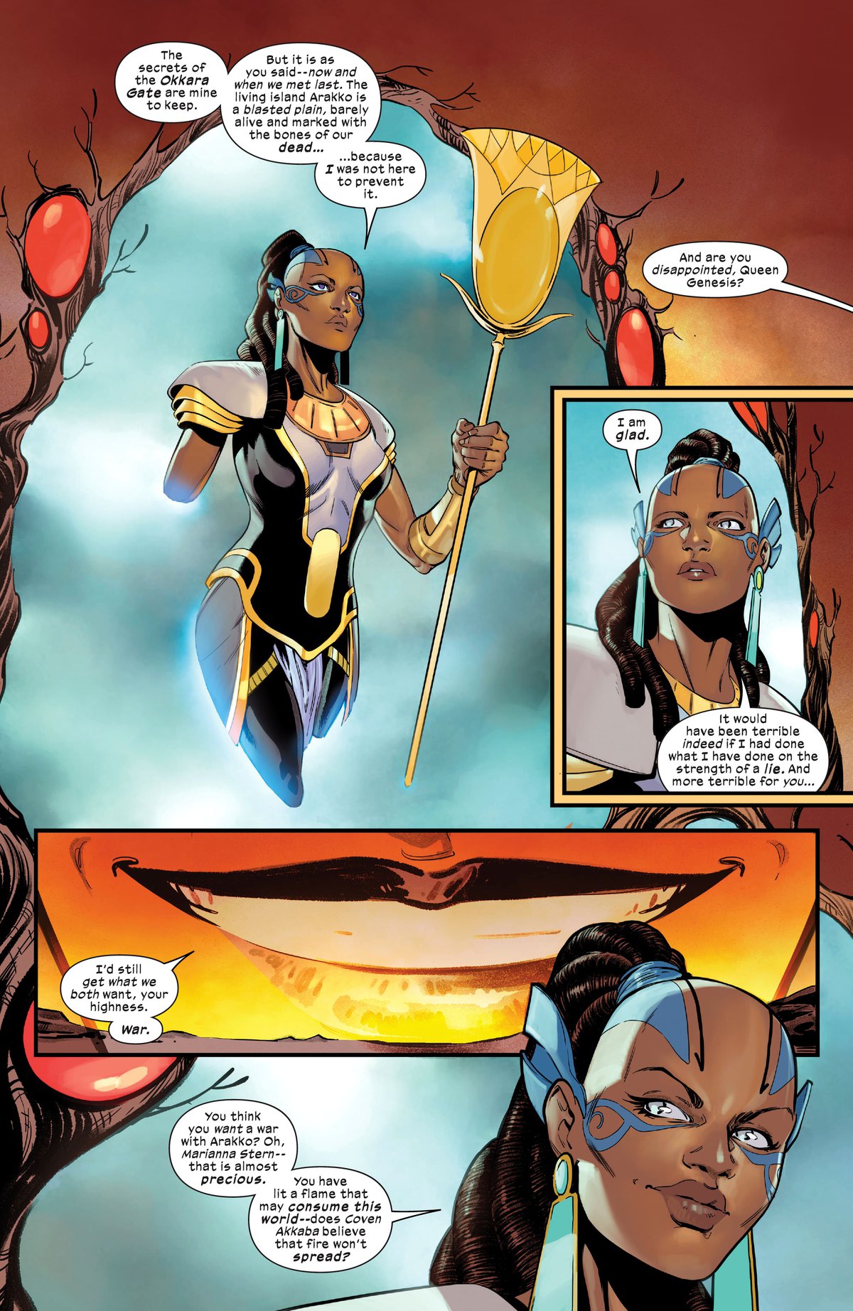 В уже вышедшем X-Men Red #12 Генезис прибыла на планету Аракко, которую люди по-прежнему называют Марсом. Этот комикс тоже писал Эл Юинг. Похоже, именно в Heralds of Apocalypse расскажут, как она это сделала. --I A I-- ещё должен посмотреть флешбеки времён острова Оккара, чтобы узнать, какими словами Генезис тогда заставила Аннигиляцию пойти на переговоры.