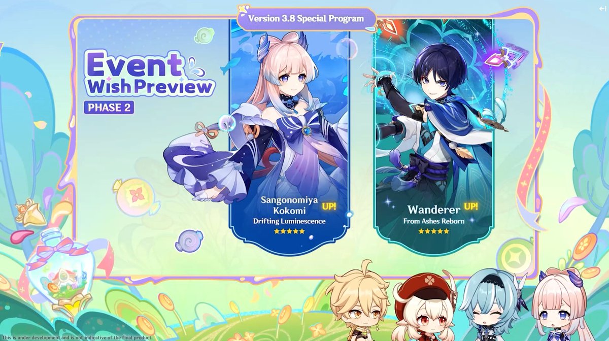 Пятизвездными героями второго баннера станут Странник и Кокоми. По словам инсайдеров, полный состав второго баннера обновления 3.8 выглядит следующим образом: