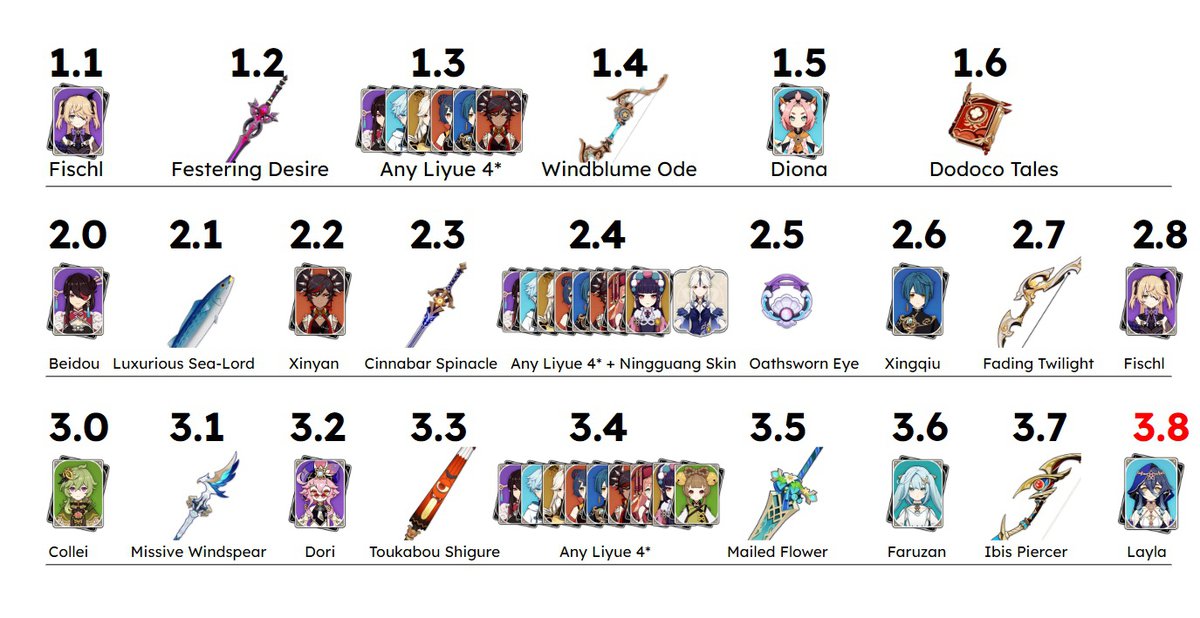 С учетом обновления 3.8 разработчики Genshin Impact раздали игрокам 13 персонажей. В трех случаях игрокам предлагалось несколько героев на выбор, в двух случаях можно было забрать одного и того же героя — Фишль.