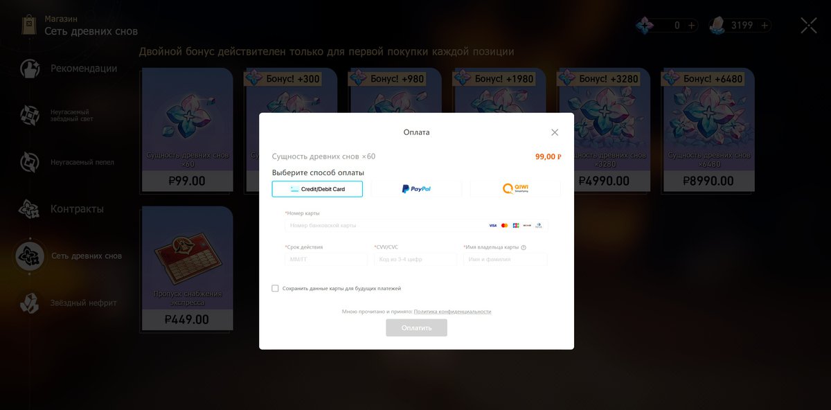 По какой-то причине поддержка карт МИР и платежей через «Тинькофф» пока не появилась в другой игре miHoYo, Honkai Star Rail. Здесь по-прежнему поддерживаются только обычные карты VISA и Mastercard, а также PayPal.
