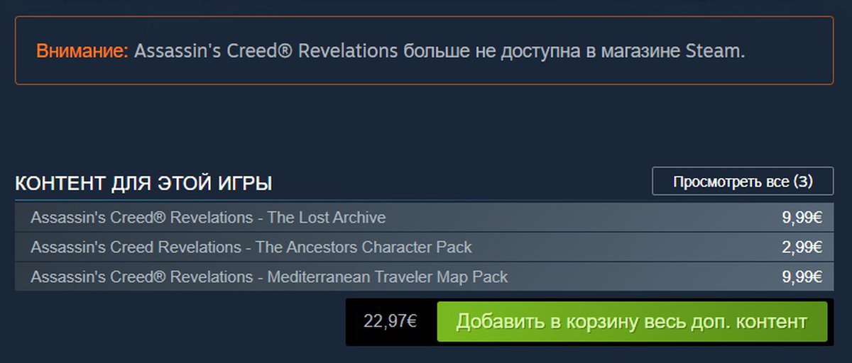 Примечательно, что в магазине все еще можно купить дополнительный контент для Assassin's Creed Revelations. Сама игра по-прежнему доступна пользователям, успевшим ее приобрести.