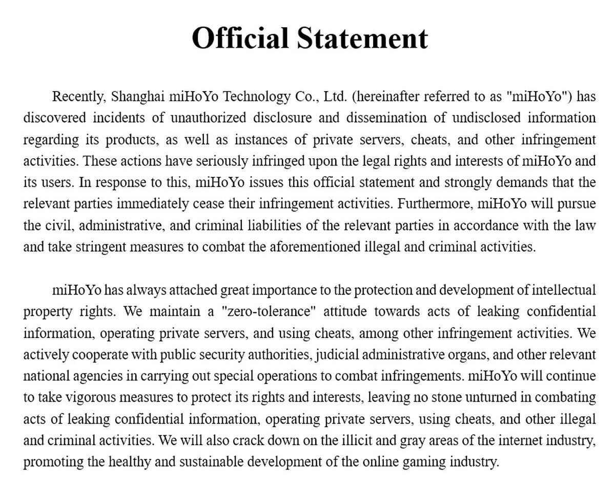 В рамках проведения операций по борьбе с нарушениями мы активно сотрудничаем с органами безопасности, судебными органами и другими национальными агентствами. MiHoYo сделает все возможное для противостояния утечкам, использованию читов, созданию частных серверов и другой противоправной деятельности.