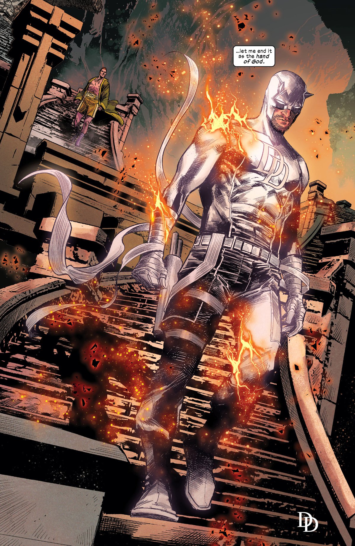 Свой поход Мэтт начал в 12-ом выпуске, оказалось, что у него в этом месте даже есть союзник, его отец, тот самый боксёр. Хотя, возможно, что это просто кто-то такой облик принял. А ещё у Сорвиголовы костюм выгорел в белый цвет.
