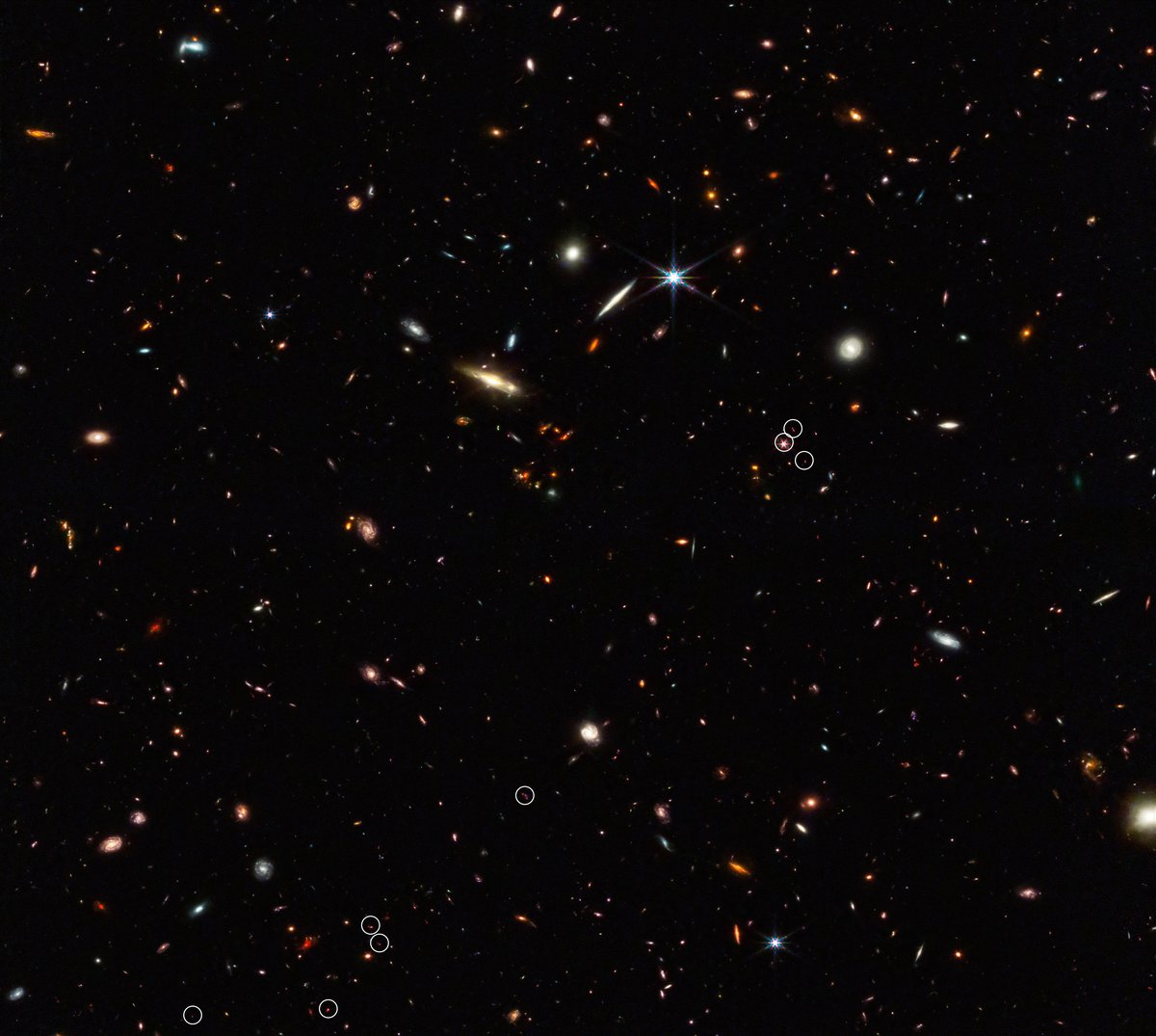 На изображении, опубликованном NASA, галактики, входящие в нить, отмечены кружками. В некоторых кружках есть больше одной галактики.