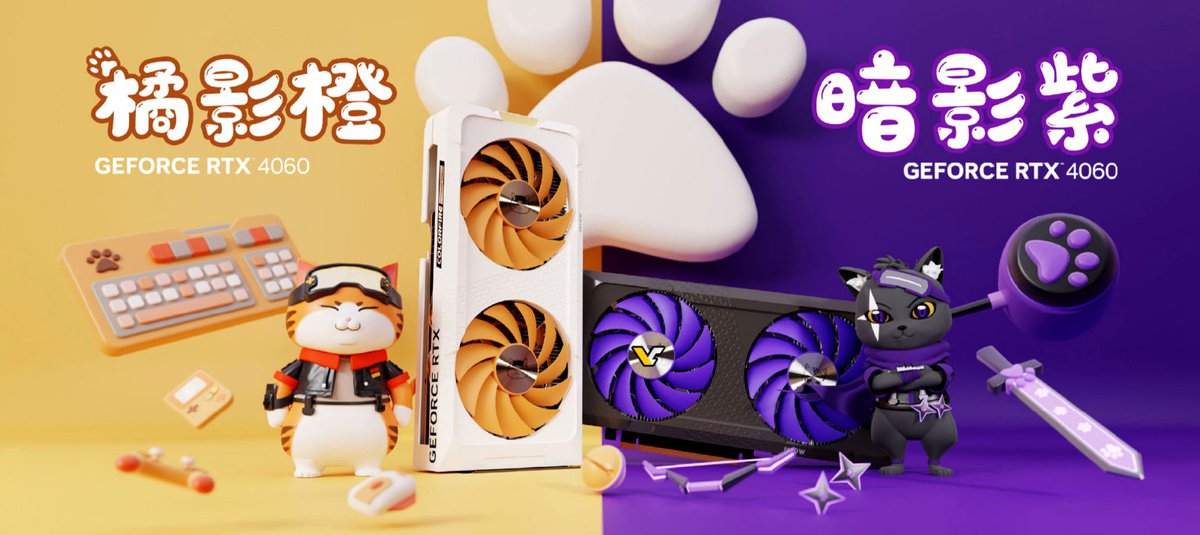 Компания показала сразу две модели мяу-версии GeForce RTX 4060. Первая карта выполнена в черно-фиолетовом цвете, другая — в бело-оранжевой гамме.