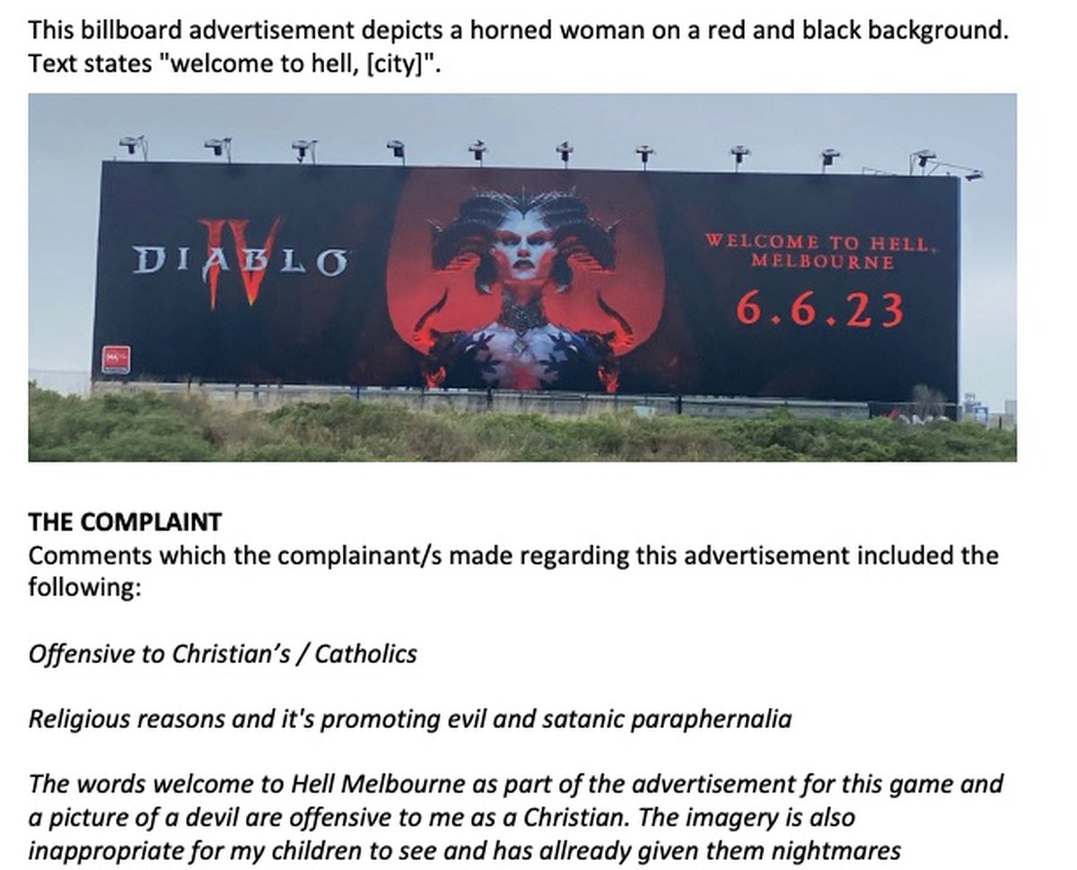 Diablo 4 рекламируется постерами с надписью «Добро пожаловать в Ад, [название города]» и изображением Лилит, главного антагониста игры. Один из таких постеров оскорбил неназванного 43-летнего жителя Австралии.