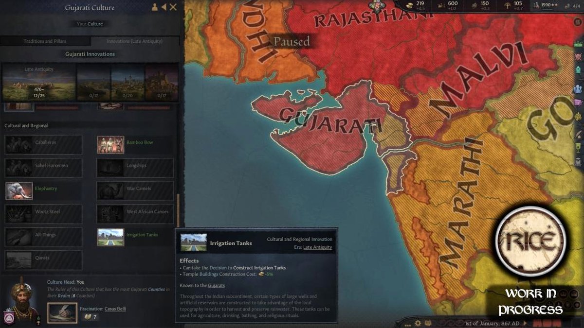 А ещё появятся решения для строительства резервуаров, будут переделаны механики Великого шёлкового пути с учётом торговли через Индийский океан и многое другое. Также будет связь этого контента с модами Rajas of Asia и The Fallen Eagle, в последнем тоже хотят обновить Индию.