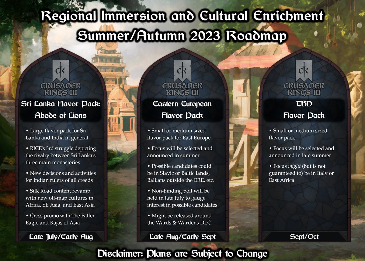 Regional Immersion and Cultural Enrichment - это мод для Crusader Kings 3, добавляющий в игру больше регионального колорита в плане культур, построек, персонажей и решений. Следующий набор называется Обитель львов, он посвящён острову Шри-Ланка, который расположен у юго-восточного побережья Индии.