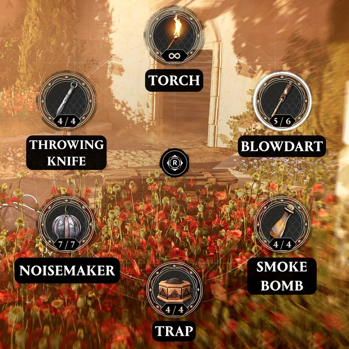 Игроки смогут использовать метательные ножи, духовую трубку, дымовую бомбу, шумовую гранату и ловушку. Скорее всего, ловушка это упоминавшаяся разработчиками сигнальная мина: она выбрасывает облако дыма при срабатывании.