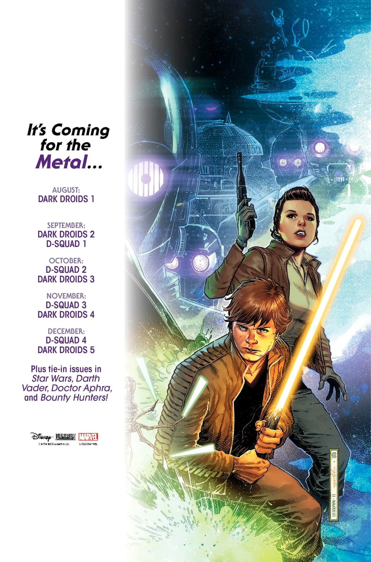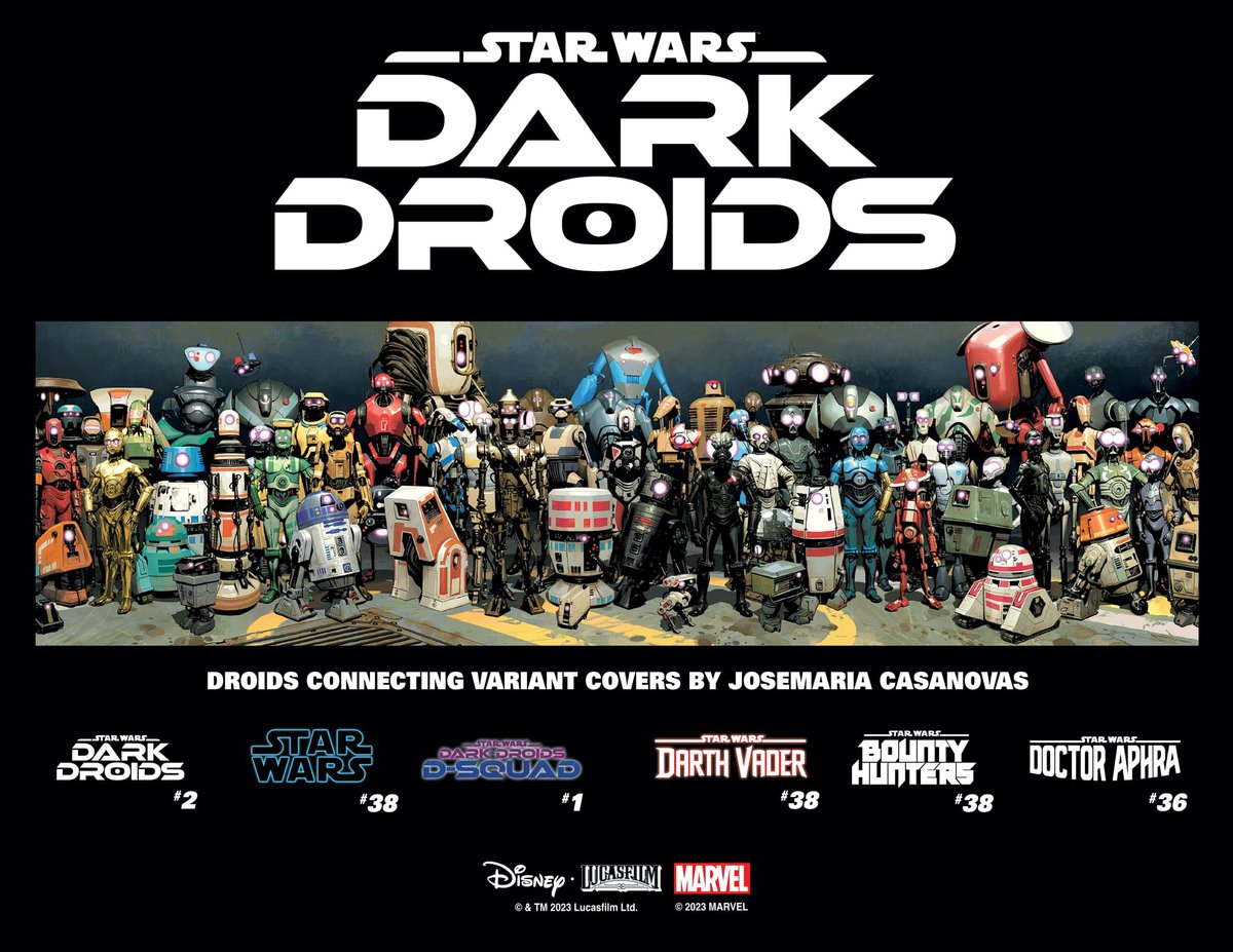 Для второй части Марвел приготовила кое-что особенное. Все её выпуски получат в качестве вариантных обложек куски огромного арта с дроидами от Хосемарии Казановаса. Чтобы собрать картинку, придётся их все купить.