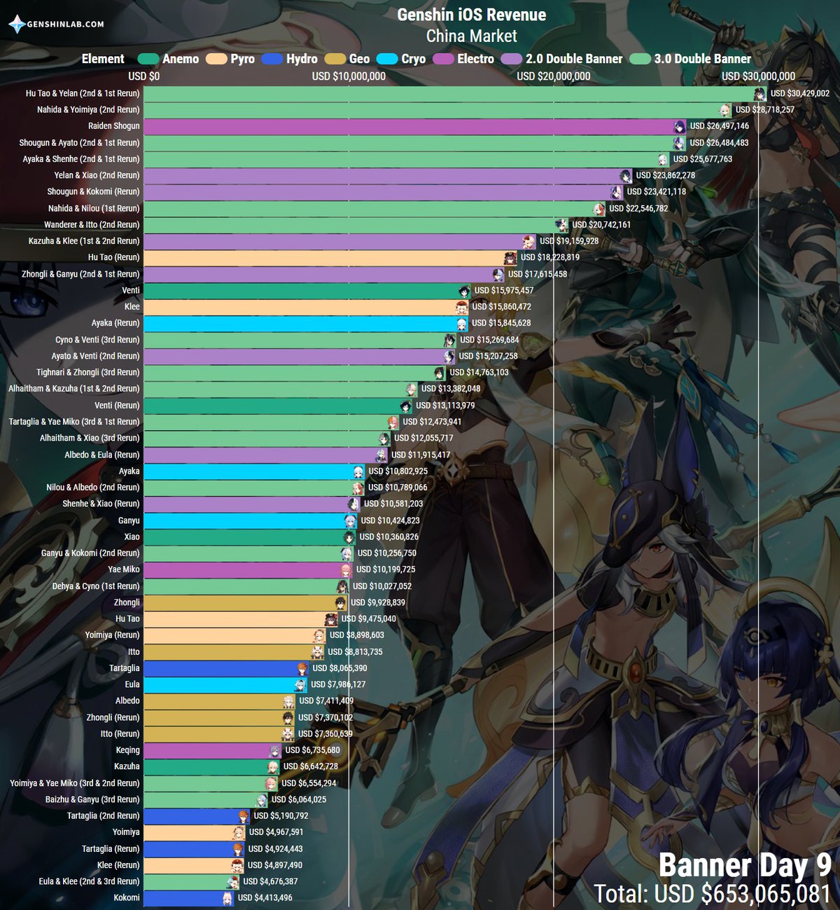 Примечательно, что разрыв между баннерами Эолы и Кокоми постепенно сокращается: когда мы собирали статистику в первый раз, разница между ними была на уровне $342 тысяч. Если ситуация не изменится, то баннер Эолы и Кли может оказаться на последнем месте по выручке.