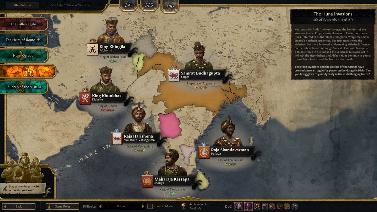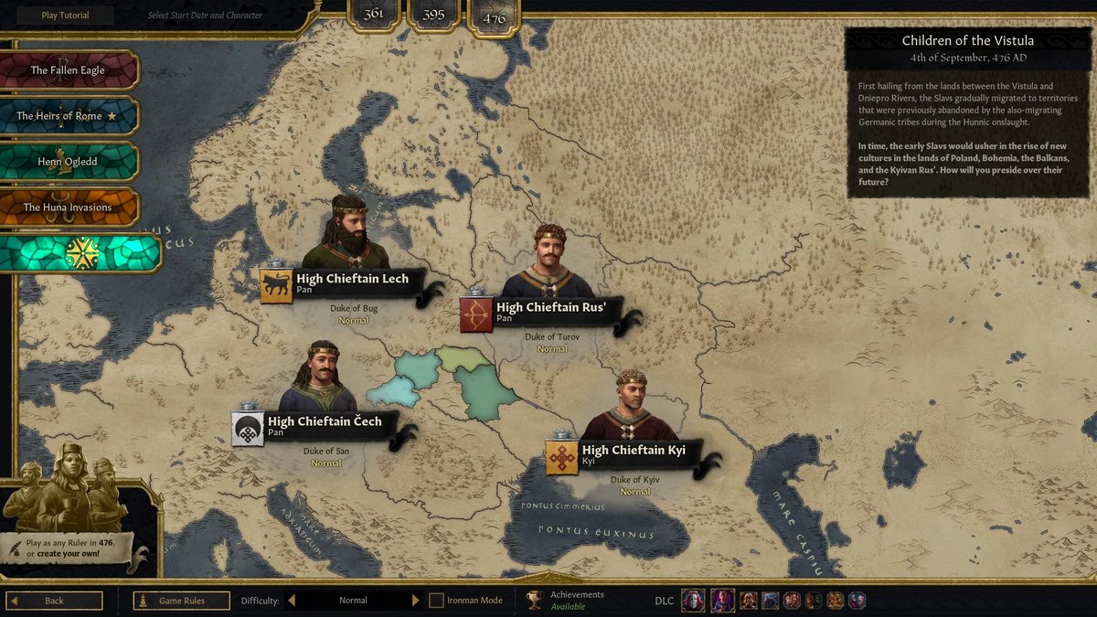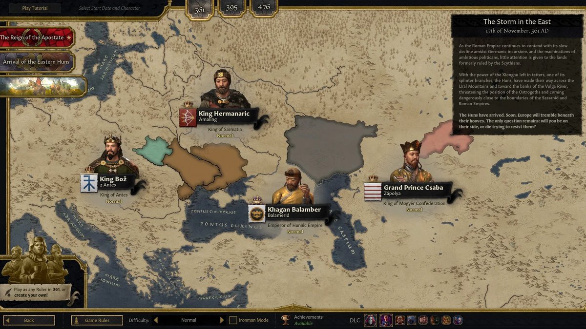 Теперь обо всё по порядку. Для старта в 361 году делают новую закладку "Буря на востоке". Здесь представлены персонажи Восточной Европы и степей. В их числе: первый царь гуннов Баламир, великий правитель остготов Эрманарих и Бож, который по данным некоторых историков повелевал славянами. Остаётся решить, возглавить вторжение гуннов или попытаться его остановить.