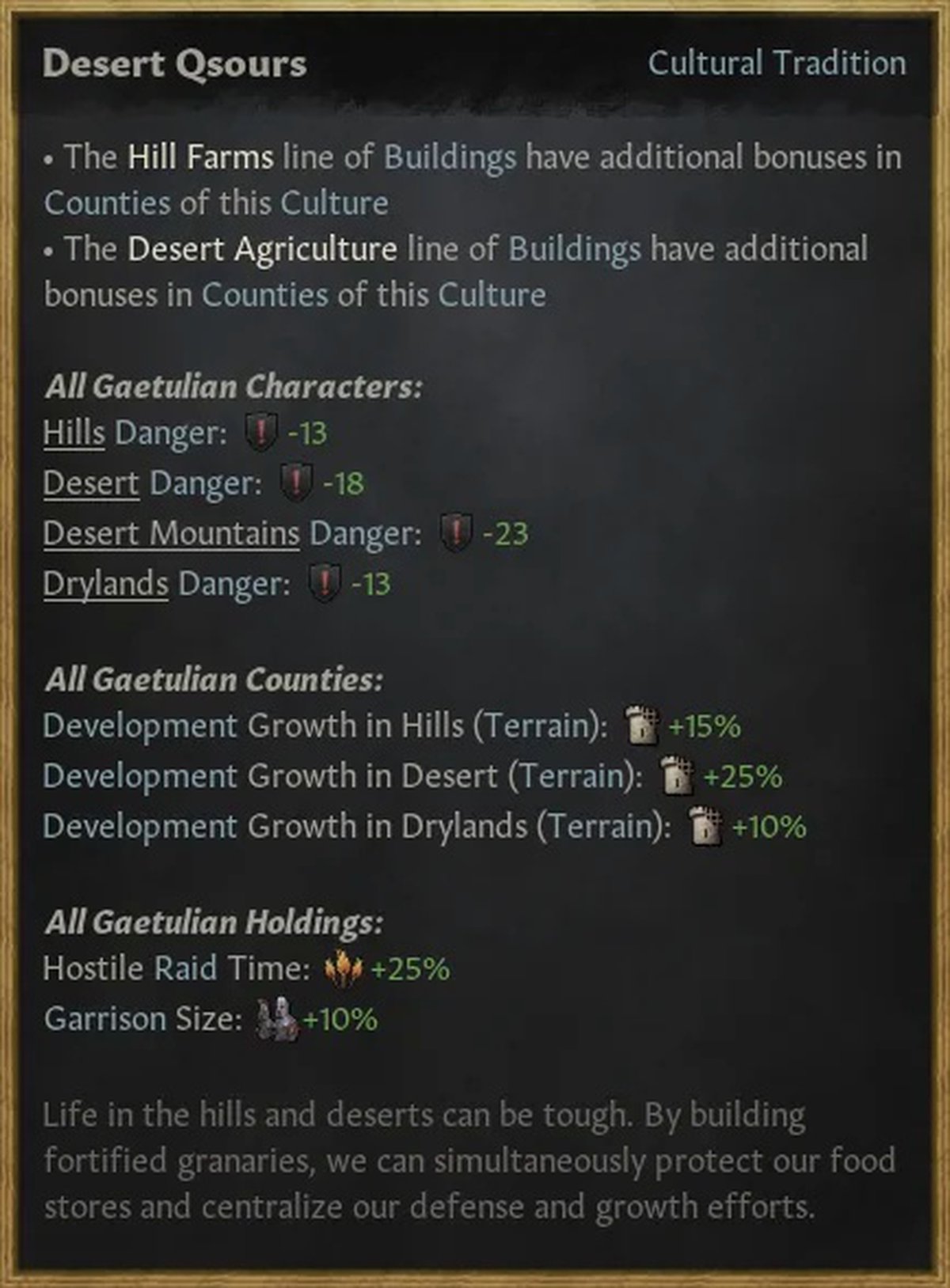 Помимо этого, показали небольшие мелочи. Культура берберов в Северной Африке получит новую традицию, которая увеличит им бонусы от зданий, повысит безопасность перемещения персонажей по определённым типа ландшафта, повысит скорость развития, замедлит скорость вражеских грабежей и повысит гарнизон.