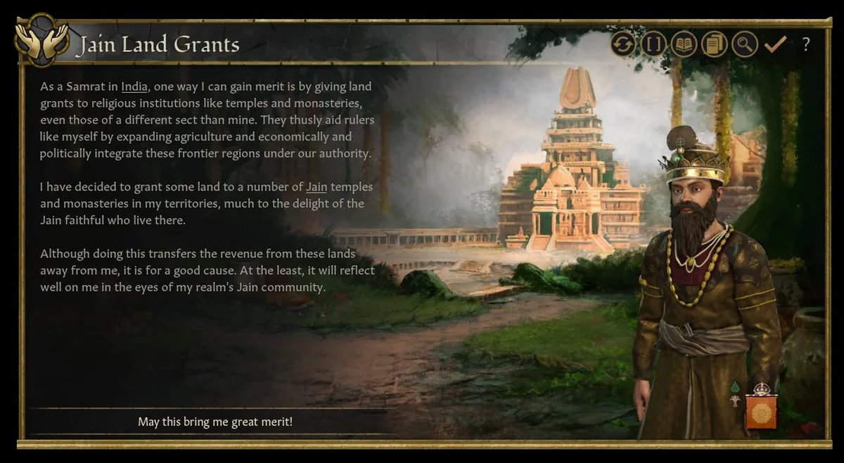 Правители в Индии могут давать гранты на землю духовным заведениям трёх религий: буддизма, брахманизма и джайнизма. Даваемый за это бонус зависит от того, исповедует ли сам персонаж и его государство эту веру.