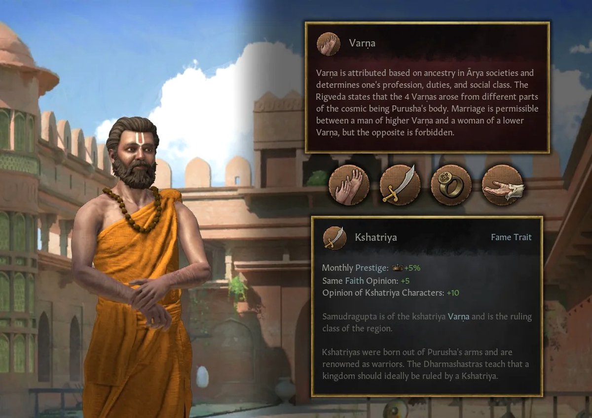 Кастовая система в эту эпоху не то что не исчезла, а стала даже более жёсткой, чем ранее. Конечно, включить тысячу каст в игру невозможно, поэтому была использована концепция Варна. Эта механика открывается при наличии у культуры традиции "Каста". В Индии такая будет у многих со старта.
