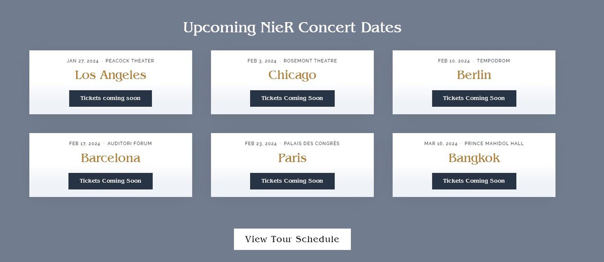 Square Enix анонсировала концерты NieR Orchestra Concert 12024, посвященные играм серии NieR. Концерты начнут проводить в 2024 году, пока анонсированы только четыре из них: в Лос-Анджелесе, Чикаго, Берлине, Барселоне, Париже и Бангкоке.