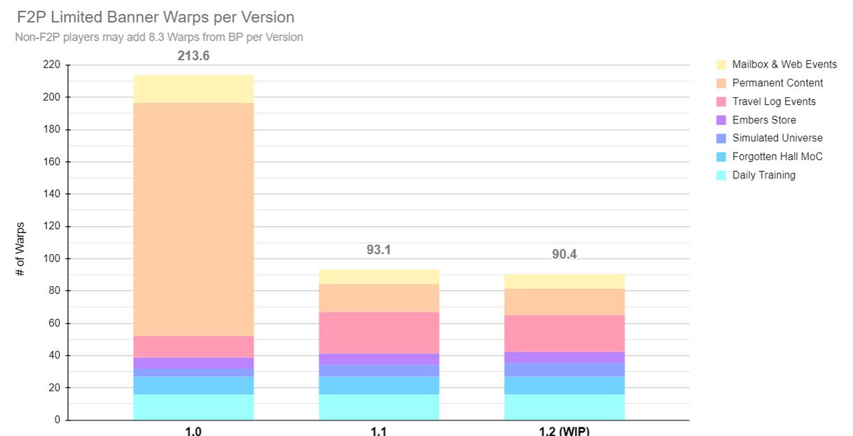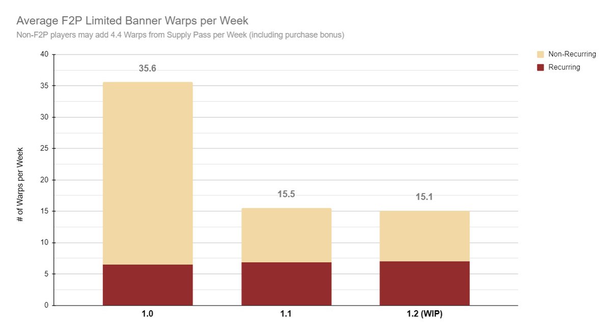 Согласно подсчетам игроков, в среднем в обновлениях 1.1 и 1.2 можно получить ресурсов, которых хватит на приблизительно 91 крутку баннеров. Можно предположить, что в ближайшем будущем этот показатель останется на том же уровне.