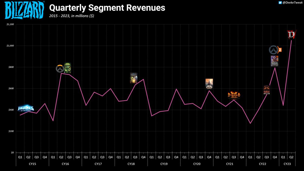 В прошлом квартальная выручка Blizzard в лучшем случае приближалась к $800 миллионам. Это происходило дважды: сперва на релизе Overwatch, затем на релизе Overwatch 2. Примечательно, что оба пика совпадали и с выходом дополнений к World of Warcraft.