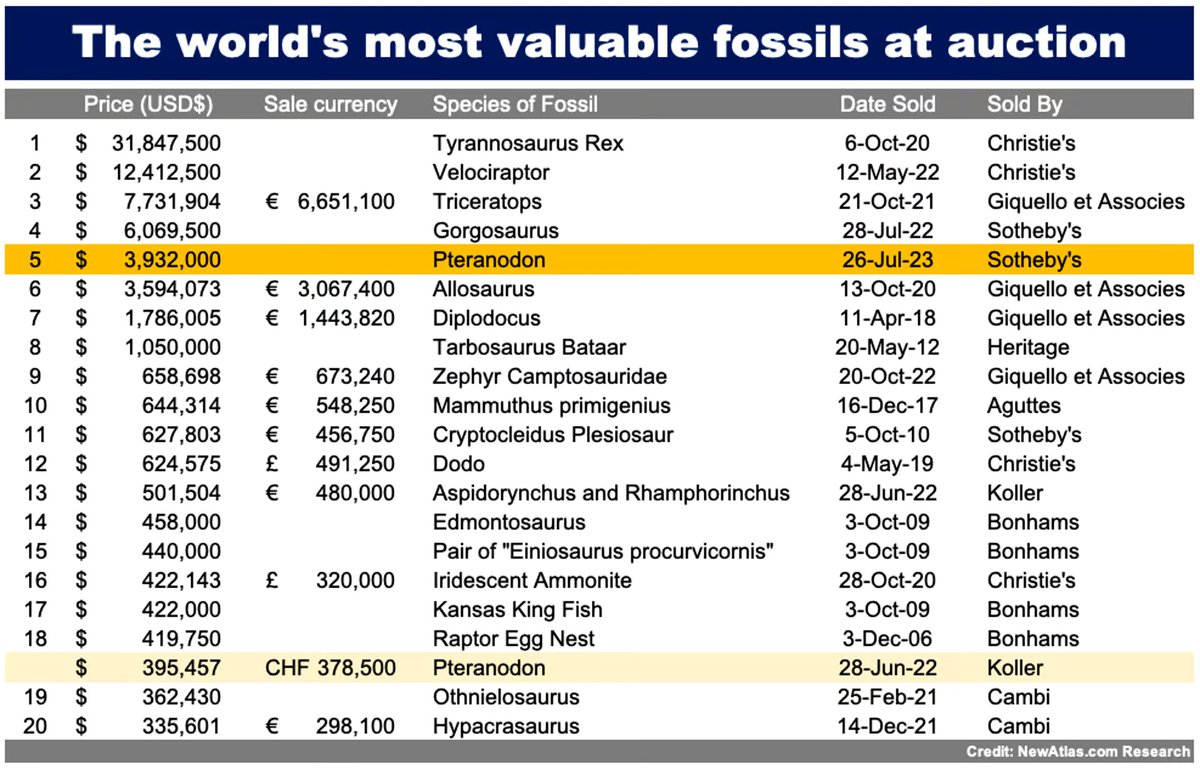 На аукционе «Сотбис» продан скелет птеранодона, доисторического летающего ящера из рода птерозавров. Торги завершились на сумме в $3.932 миллиона, это рекордная цена за скелет птеранодона.