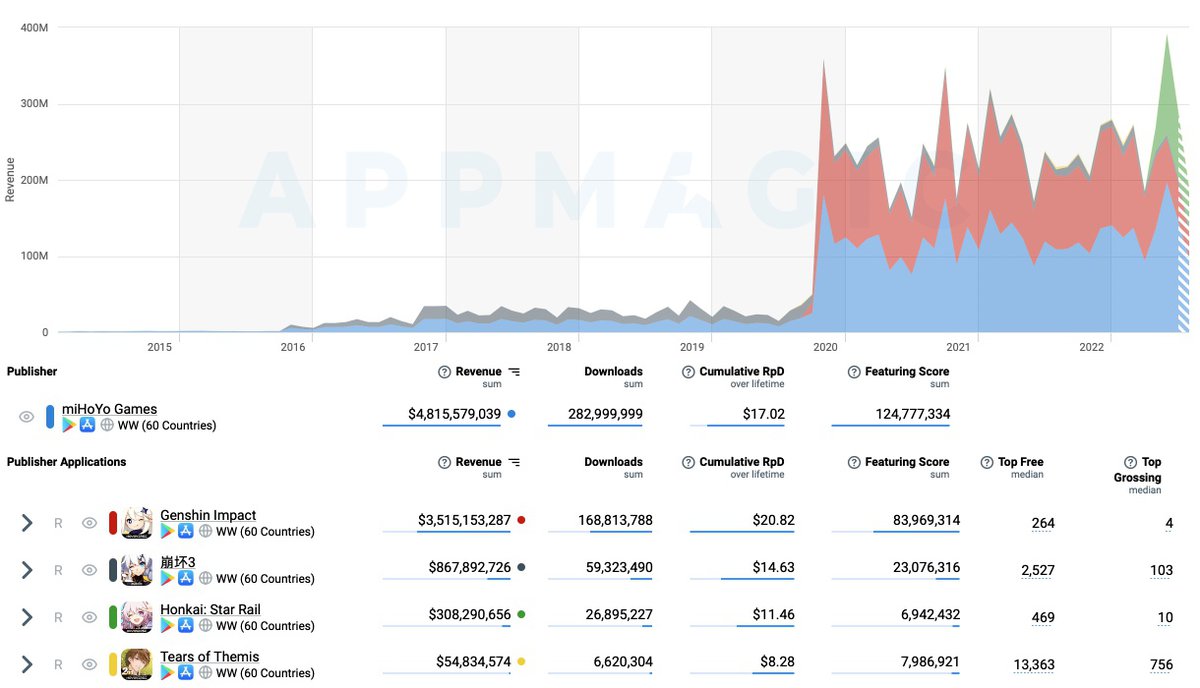 До недавнего времени основным источником прибыли miHoYo была Genshin Impact. В апреле 2023 года студия выпустила еще один крупный проект, Honkai Star Rail; согласно данным AppMagic, эта игра тоже показывает отличные результаты.