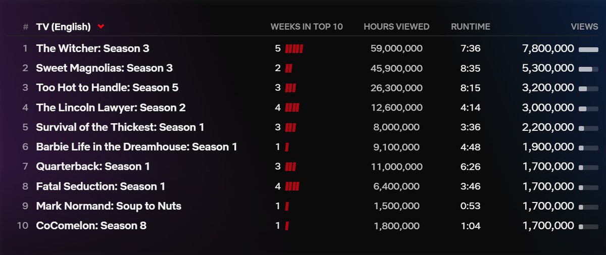 Выпуск заключительных серий третьего сезона позволил сериалу «Ведьмак» вновь возглавить недельный топ Netflix. Это всего третий раз, когда новый сезон «Ведьмака» возглавляет недельный топ.