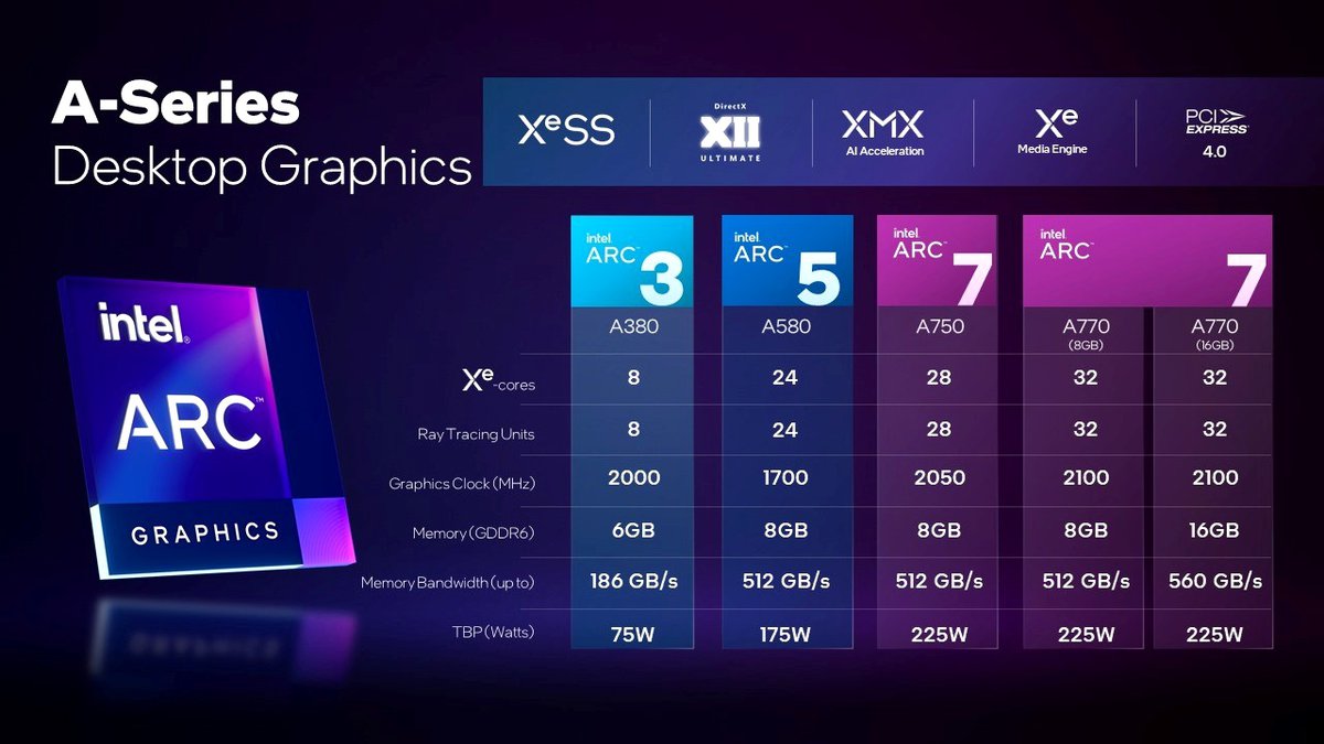 Arc A580 — последняя из анонсированных, но не выпущенных видеокарт Intel этого семейства. В общей сложности Intel анонсировала пять видеокарт: Arc A770, A750, A580, A380 и A310.