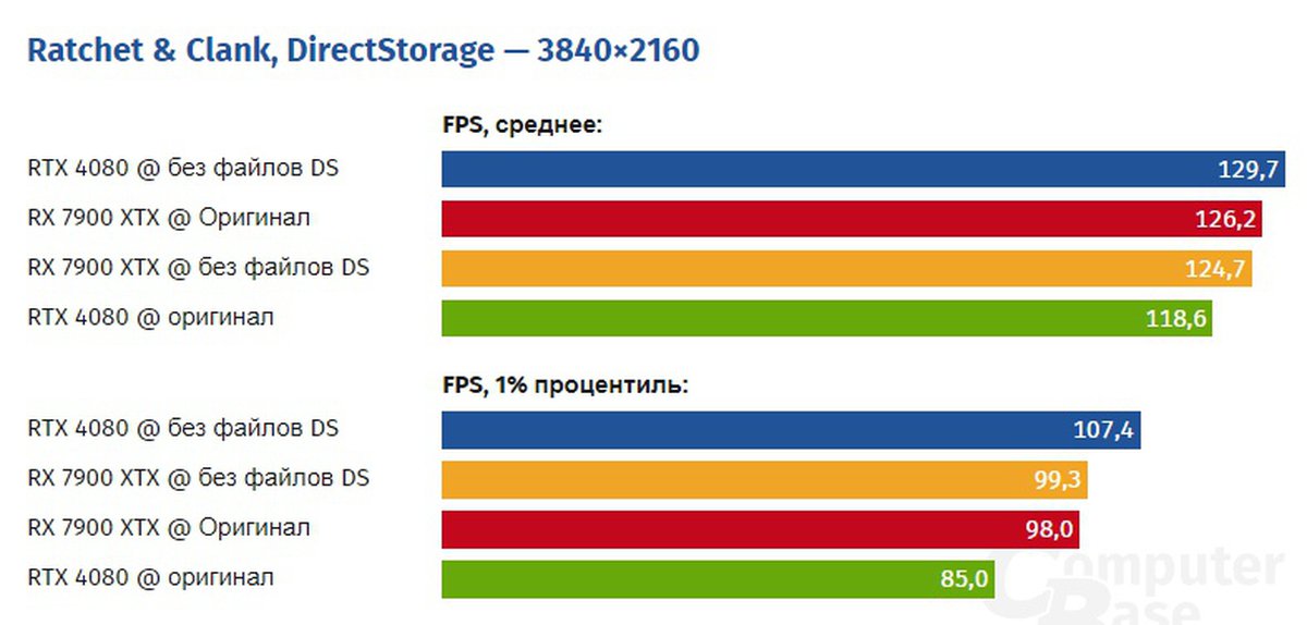 Согласно экспериментам, проведенным изданием, средняя частота кадров без DirectStorage увеличивается примерно на 10%. Минимальная частота кадров растет сильнее — примерно на 25%.