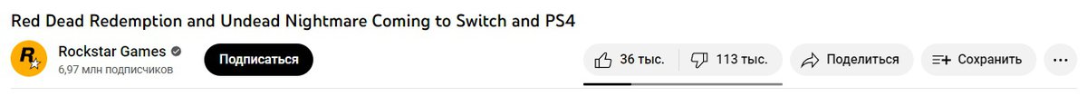 Игроки, недовольные переизданием Red Dead Redemption для PlayStation 4 и Nintendo Switch, активно дизлайкают соответствующий трейлер на YouTube. Через пару дней после анонса ролик собрал в 3 раза больше дизлайков, чем лайков.
