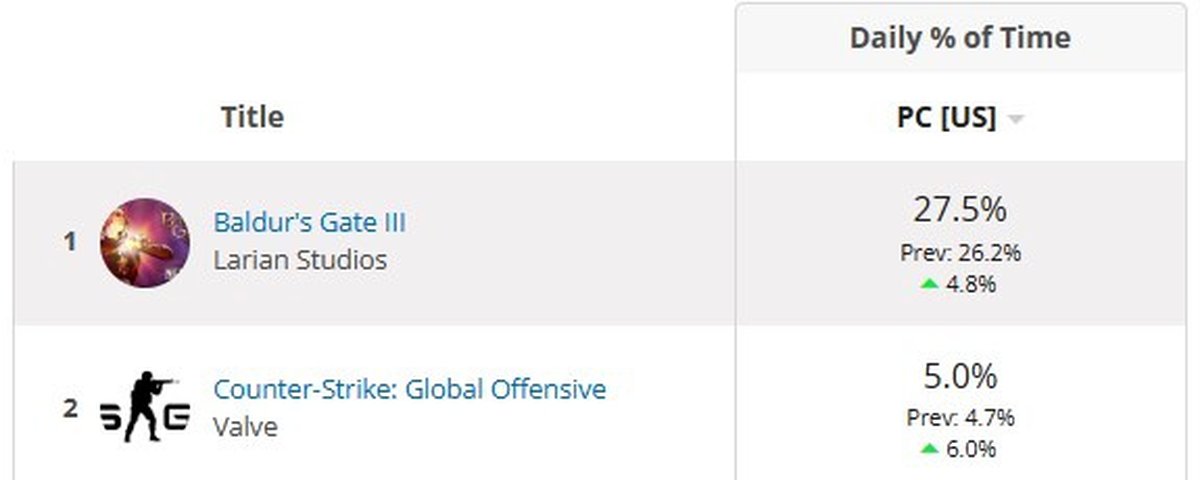 Baldur's Gate 3 пользуется очень большой популярностью на американском рынке, сообщает аналитик Circana Мэт Пискателла. Утверждается, что на долю Baldur's Gate 3 приходится 27.5% всего времени, потраченного американцами на игры.