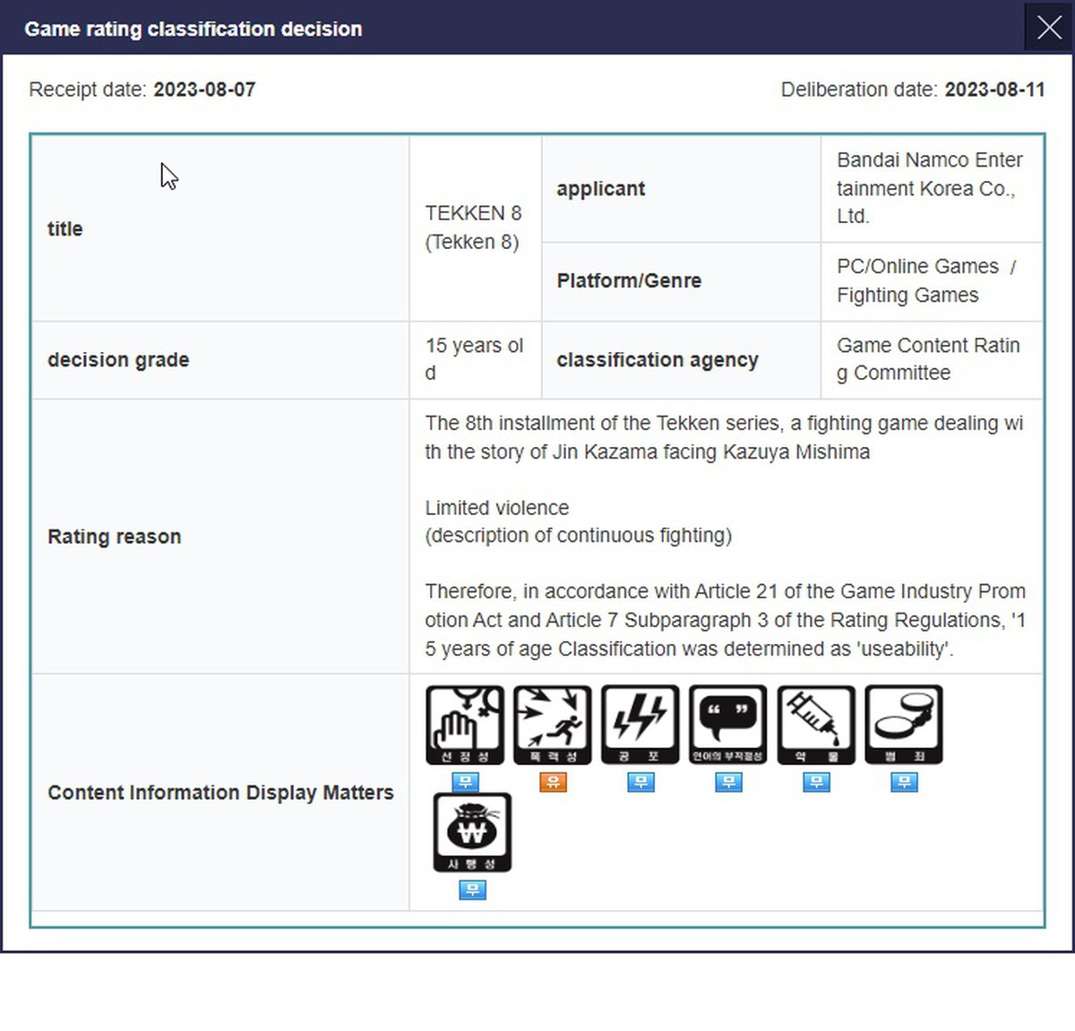 Рейтинговое агентство Южной Кореи выдало возрастной рейтинг файтингу Tekken 8. Специалисты агентства оценили версию игры для PC, ей присвоен рейтинг 15+.