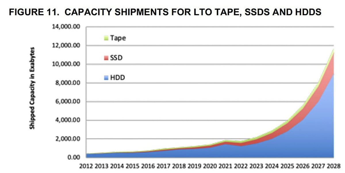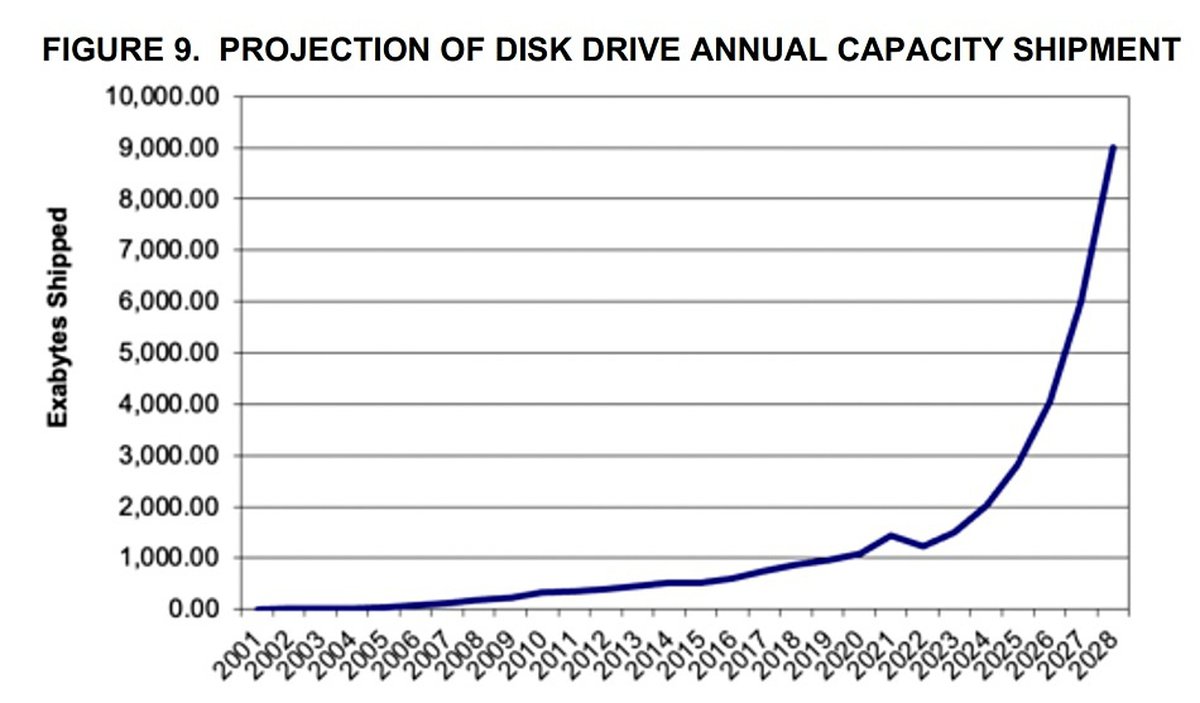 Исследователи полагают, что в 2028 году будет продано столько жестких дисков, что суммарный объем хранимой на них информации достигнет 9 тысяч экзабайт. Для сравнения: в 2023 году ожидаемый объем хранимой информации на проданных HDD прогнозируется на уровне 1500 экзабайт.