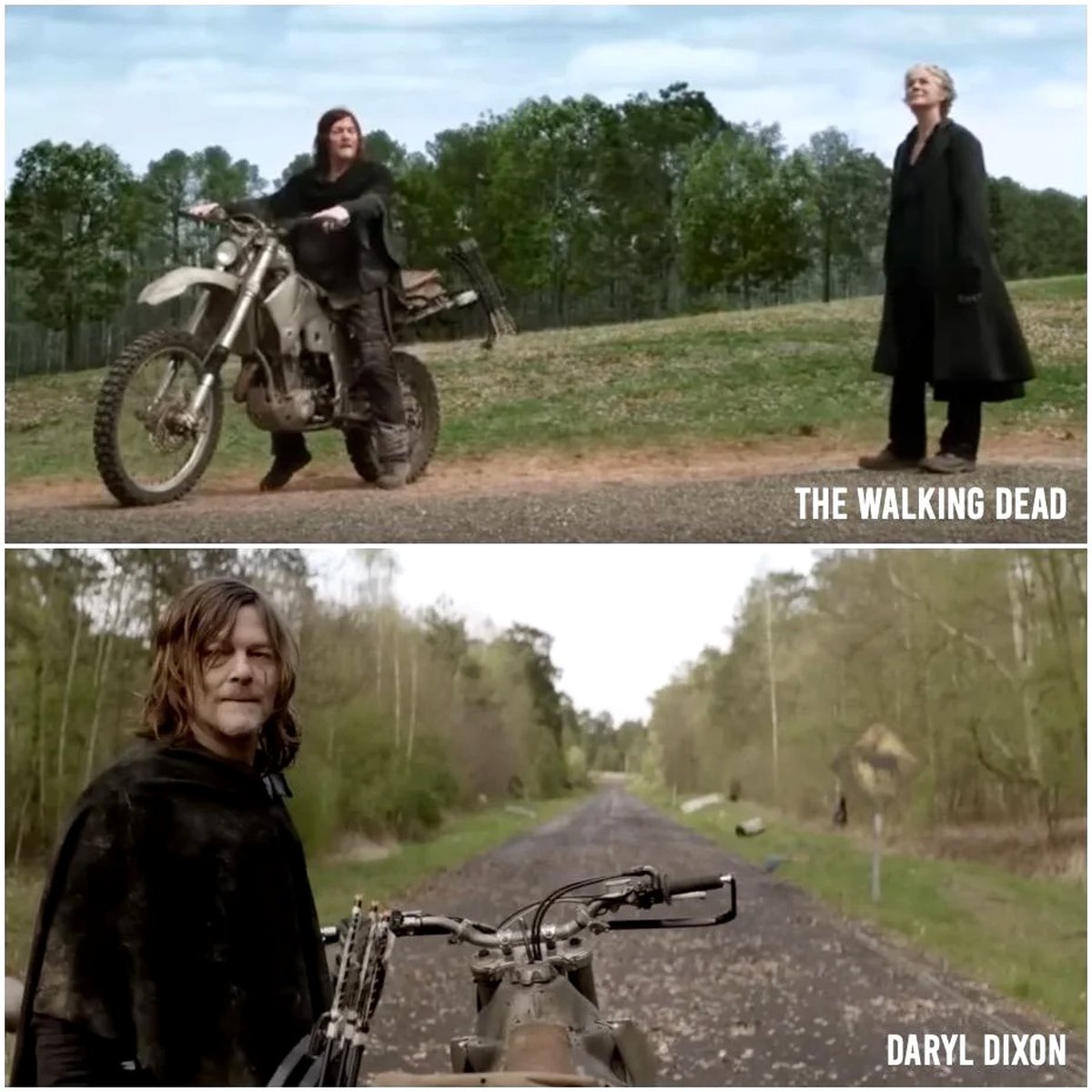 Речь идет о сцене с Дэрилом, стоящим на дороге у мотоцикла. Очень похожая сцена, заметили в ComicBook, есть в финале оригинального сериала, когда Дэрил оставляет старых друзей, отправляясь навстречу приключениям.