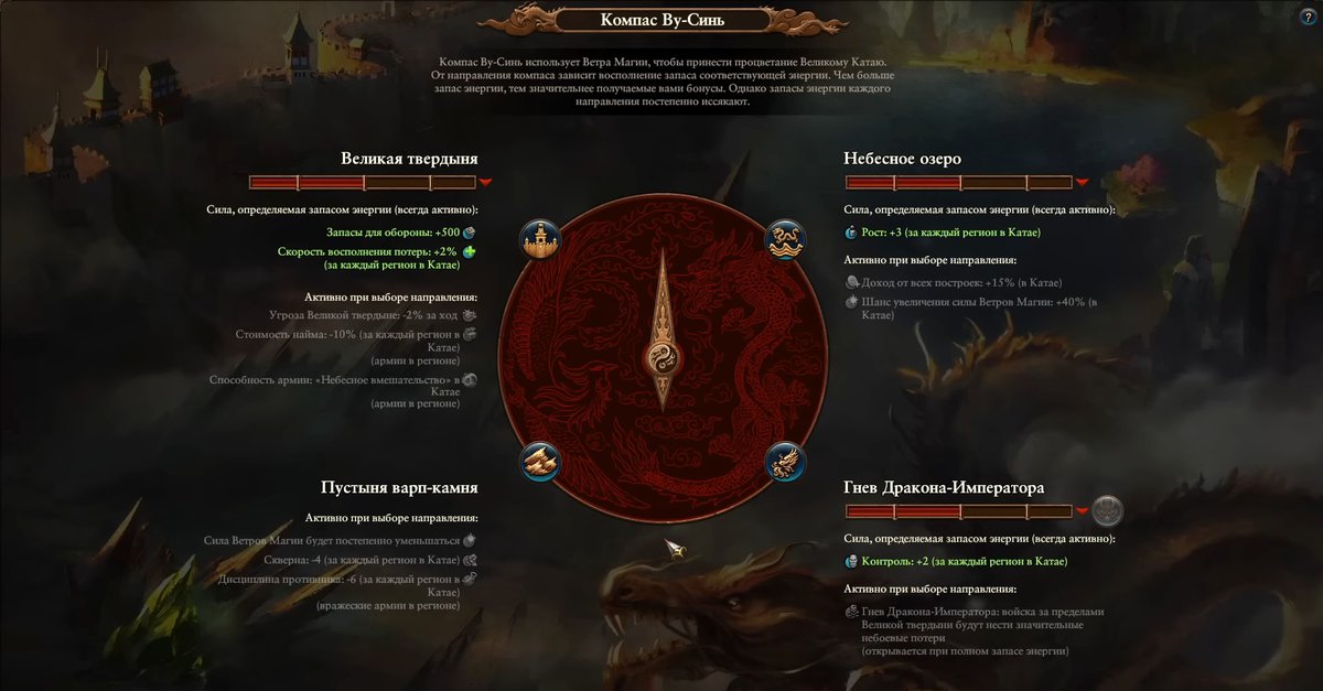 Эффекты компаса тоже меняют. В текущих есть потенциальная проблема. Там некоторые вещи зависят от регионов в Катае. А вот новая фракция из DLC в кампании Бессмертные Империи пойдёт в Люстрию.